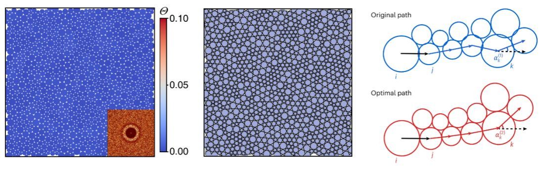左图为二维理想非晶体的位型图,插图为对应的静态结构因子;中图为理想非晶中隐藏的相干路径;右图展示了基于相干路径定义的类似路径积分的空间关联表征方法。